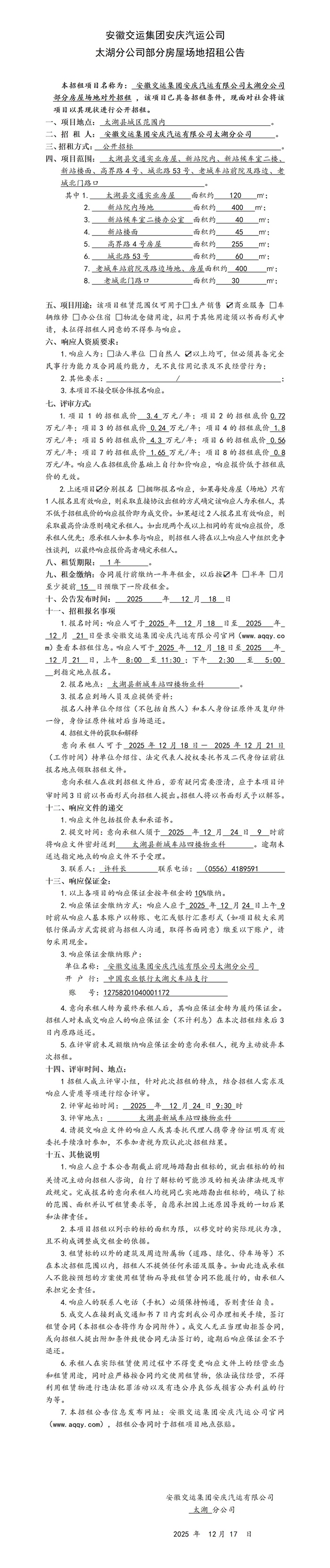 太湖分公司房屋場地招租公告